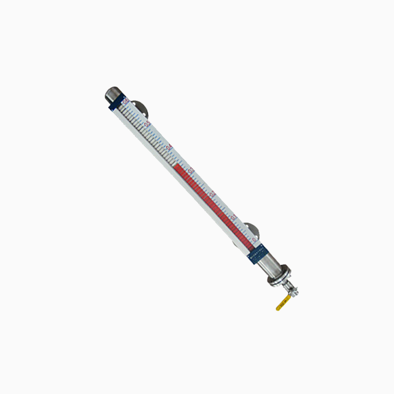 磁翻板液位计是以磁浮子为感测元件,并通过磁性浮子与显示色柱中磁性体的磁耦合作用,反应被测液体或界面的测量仪表。磁翻板液位计应用连通管原理,保证被测容器与测量管体间的液位相等,当测量管中的浮子随被测液体等量变化,浮子中的磁性体与显示板上显示色柱中的磁性体耦合作用,使色柱翻转,白色表示无液,红色表示有液,以达到接地显示液位的数值。液位计可就地直接指示液位亦可附加液位报警器和远传,实现远距离液位报警和监控。磁翻板液位计(也可称为磁性浮子液位计)根据浮力原理和磁性耦合作用研制而成。在与容器连接的连通管内,浮筒随管内的液面上升、下降从而反映容器的液位变化,然后通过浮简内的磁钢,将液位的变化传输到红、白指示反光柱上。液位上升时,红半萤光柱连续翻向外面,液位下降时,白半反光柱连续翻向外面。根据红半反光柱指示的液位高度读出具体数值。